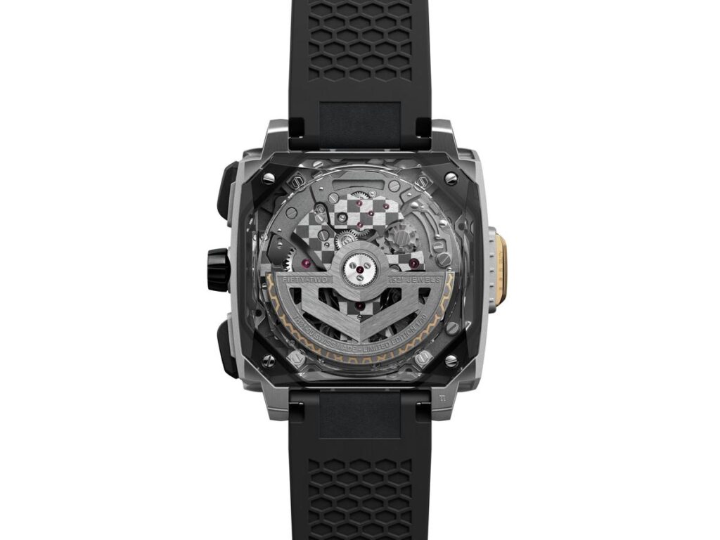 この時計のハイテクな外観を完成させるのが、上部からムーブメントの内部機構を見ることができる半透明のサファイアダイヤル、ブラックDLCコーティングを施したグレード5チタン製のクロノグラフプッシュボタンとテーパードリューズ、ゴールドのクロノグラフ針や先端がゴールドになった時・分針とインデックス、そして4本のネジで固定されたフロントとケースバックのサファイアクリスタルです。 9時位置のスプリットセコンドのプッシュボタンは、ソリッド2Nイエローゴールド製でオリジナルの「モナコ」の左リューズへのオマージュとなっています。この時計には、アルカンターラのインサートをかぶせたスポーティーなブラックラバーストラップが取り付けられ、ブラックDLCのグレード5チタン製のバックルが採用されています。