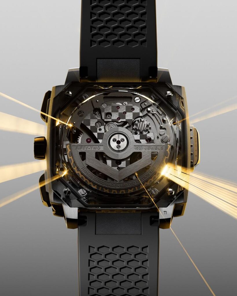 こうしたパーツが組み合わされることで、複雑な外骨格のような構造が形成されます。ハイパフォーマンスカーの格子状エンジンカバーに着想を得た、メッシュ状の2層ハニカム構造がムーブメントを囲む役割を果たしています。ケース、格子、ベゼルはすべてグレード5チタン製で、ベゼル下部の格子のみソリッド2Nイエローゴールドを使用することで、ハイテク素材と貴金属が美しく融合しています。グレード5チタン製ベゼルにはブラックDLCコーティングが施されることで、精悍なコントラストを生み、この時計の存在感あるシルエットを際立たせます。