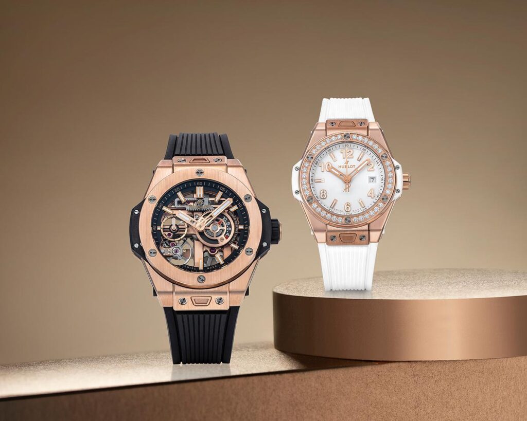 新作「ビッグ・バン メカ-10 キングゴールド」は、約10日間のパワーリザーブを誇る自社開発・製造ムーブメント「メカ-10」を42mmのケース径に再構築し、独自素材18Kキングゴールド製ケースにラバーストラップを組み合わせた、大胆で独創的なデザインが特徴のタイムピースです。また、レディースの「ビッグ・バン ワンクリック キングゴールド ホワイト ダイヤモンド」は、ホワイトで統一したダイアルとラバーストラップ、そしてベゼルに配したダイヤモンドの輝きが、上品で洗練された腕元を演出します。「ビッグ・バン」コレクションのペアウォッチとしてもお楽しみいただけます。この機会に、ウブロの唯一無二のタイムピースをぜひご覧ください。