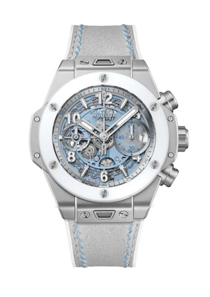 世界限定30本の「ビッグ・バン ウニコ ウィンター サファイア」は、優れた耐傷性を兼ね備え、高い透明度と輝きを放ちます。そして、世界限定200本の「ビッグ・バン ウニコ ウィンター チタニウム セラミック」は、羽のように軽いチタニウム製ケースにホワイトセラミック製ベゼルを組み合わせています。両モデルともケース径42mm、ウブロが特許を取得している「ワンクリック」システムを搭載しています。鮮やかなホワイトまたはアイスブルーのカーフスキンにラバーを裏打ちした交換可能な2本のストラップが付属します。瞬時にスロープモードからナイトモードへ、ストラップを付け替えることができます。
