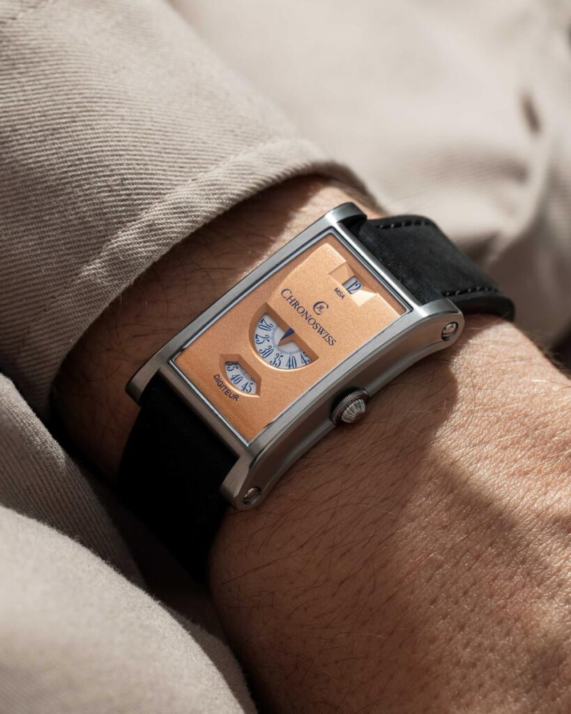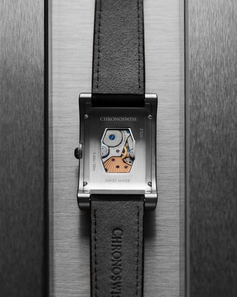 ケース側面のサンドブラスト加工は、シャープで幾何学的な構造デザインに軽やかな雰囲気を与え、絶妙なコントラストを添えています。リューズは、クロノスイスの伝統的なオニオンクラウンを現代的にアレンジし、伝統と革新を実現しました。