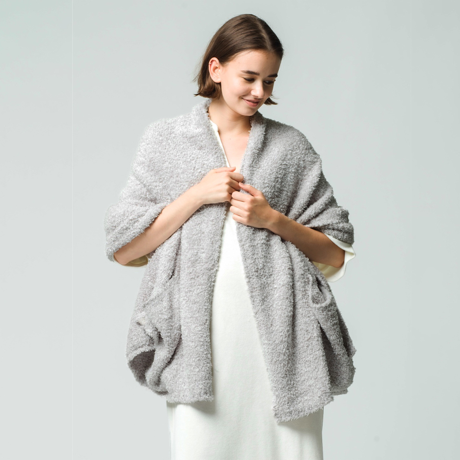 CozyChic素材のトラベルショール。ブランケット代わりはもちろん、さっと羽織ってお出かけや、防寒対策、授乳ケープにもなる万能アイテム。ポケットに織り込むとクッションにもなる優れものです。