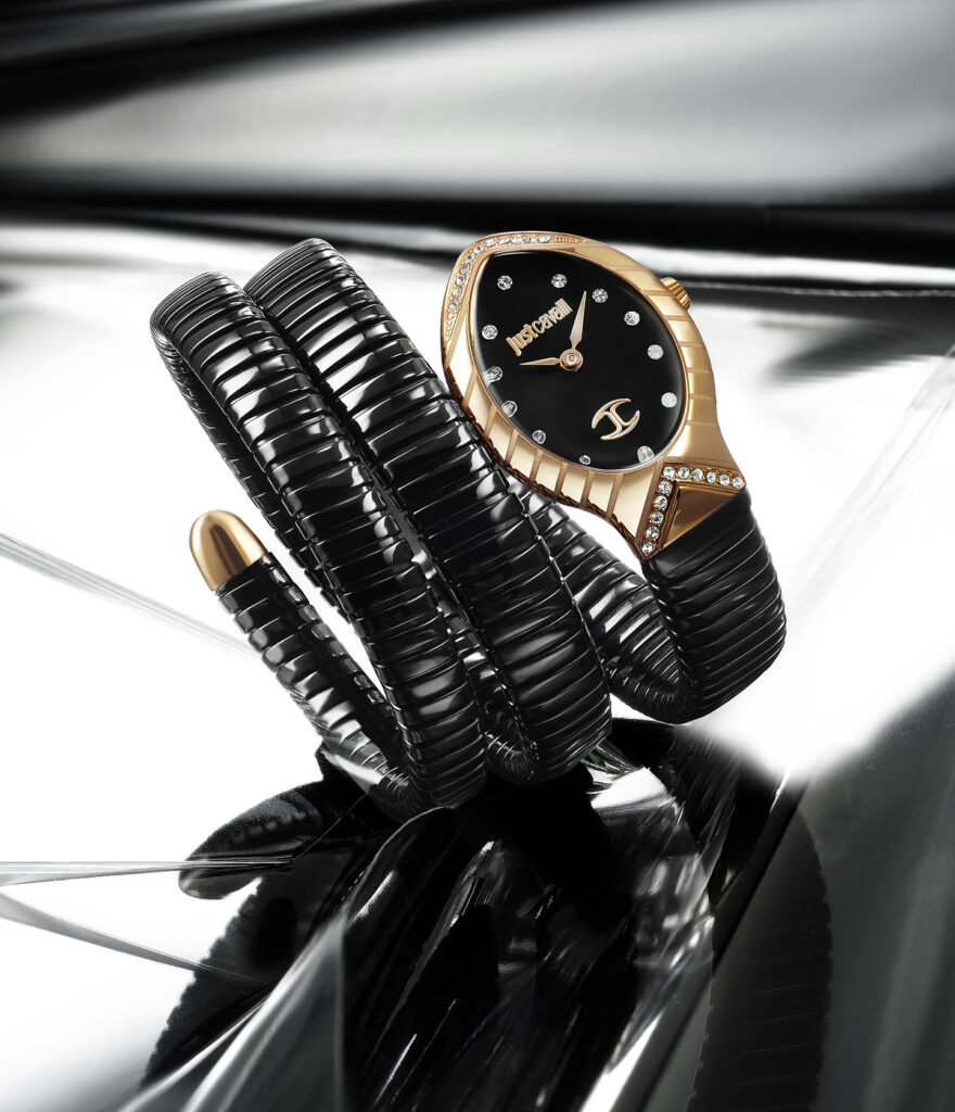 ロベルト カヴァリが創立してから25年を迎えた『Just cavalli(ジャスト カヴァリ)』。腕時計に対して前衛的なアプローチで臨むデザインで、幅広いユーザー層を持つブランドでもあります。とはいえ万人向けの腕時計ばかりをリリースしているわけではなく、ユーザーをピンポイントに絞ったシリーズも見受けられます。中でもここで紹介する1本は特に個性的で、賛否両論、はっきりと好みが二分されることでしょう。しかし、感性がピッタリとマッチした女性にとっては非常に魅力的な腕時計に映ることは間違いありません。ブレスレット感覚が大いに楽しめるタイムピースとして、プレゼントにも喜ばれることだと思います。