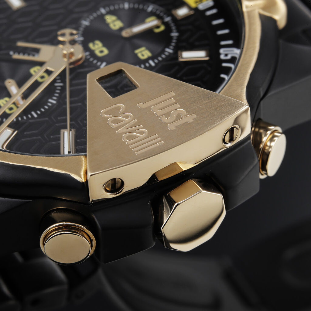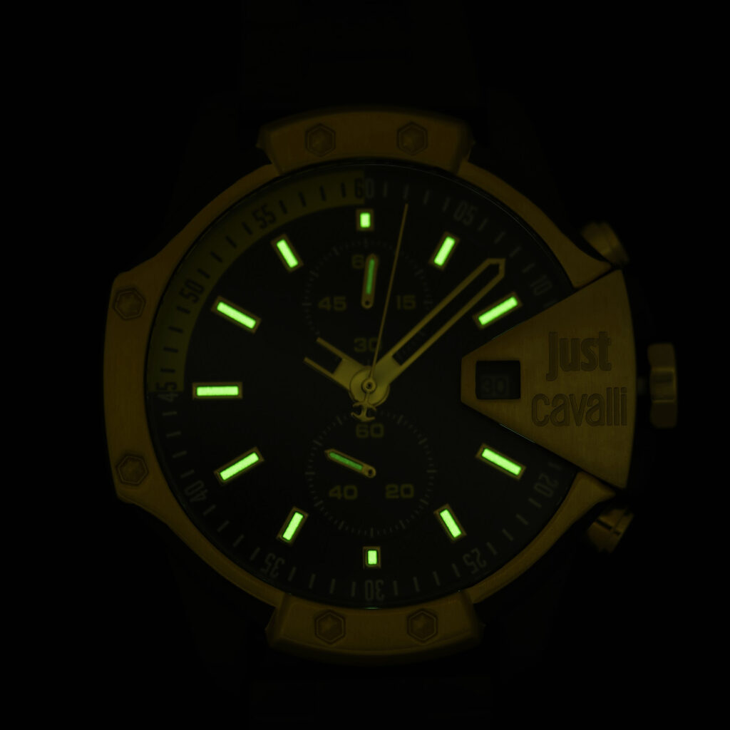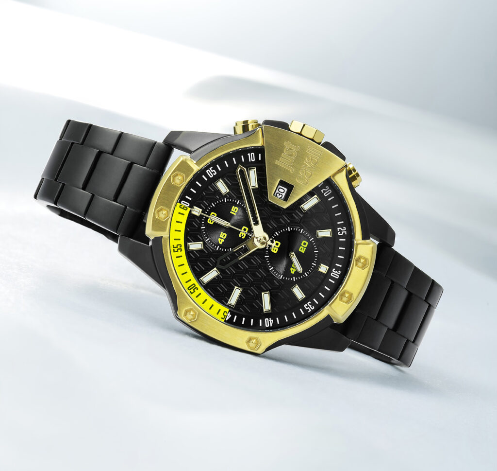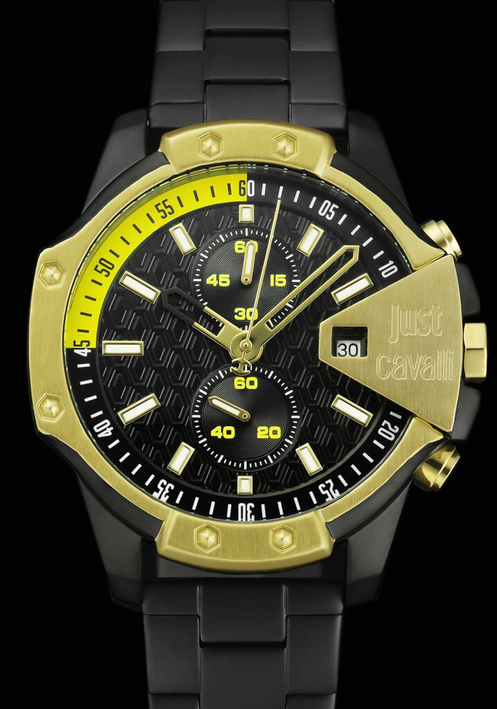 スポーツカジュアルを意識している人にアピールしたいのが、このジャスト カヴァリの『Sarno(サルノ)』。45㎜の堂々としたボディサイズをはじめ、クールな部分が随所に見られるクロノグラフです。もっとも特徴的なのはベゼル部。天地左右にボリュームを持たせた独特なベゼルカバーにロベルト カヴァリっぽさを感じさせます。特に3時位置のブランドロゴが刻印されたデイト窓のプレートなどは巨匠ならではのデザインと言えますし、インダイヤルを含めて各針類もかなり個性的です。また、オリジナリティに加えて、より一層クールに魅せる要因がマットブラックのSSブレス。クラスを超越した高級感をも味合わせてくれます。