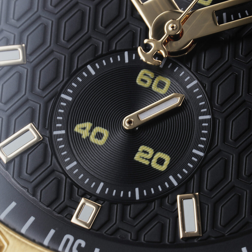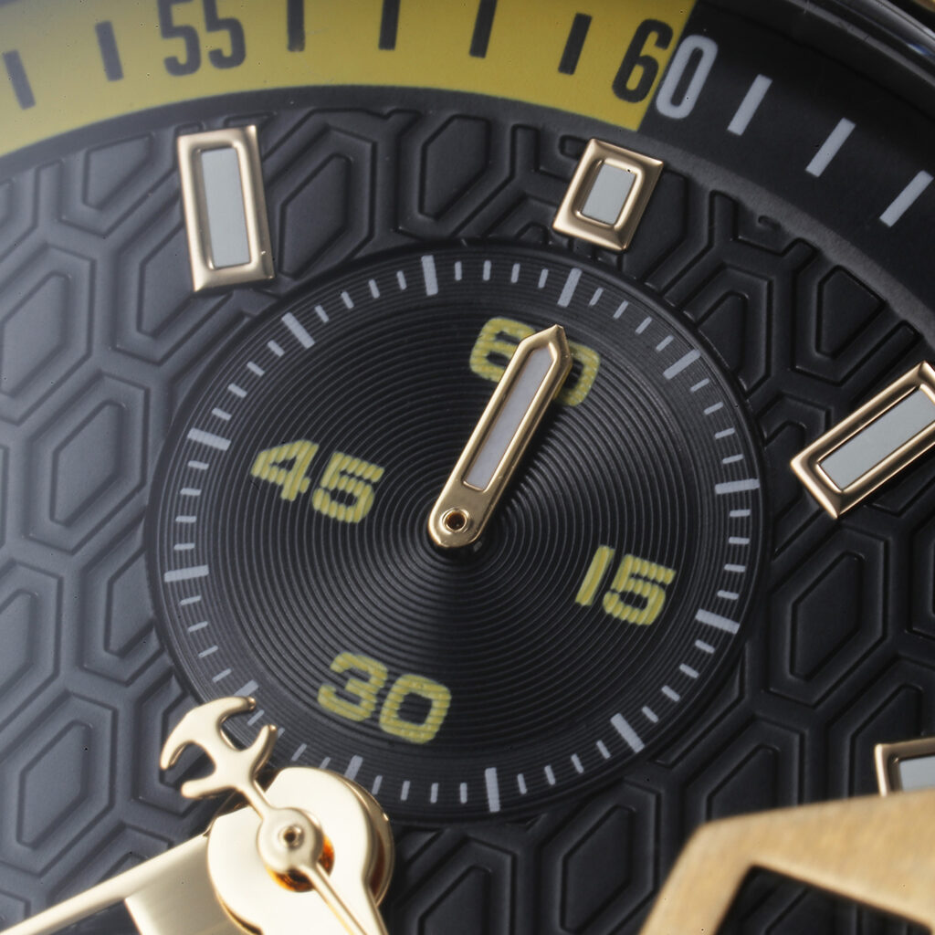 ベゼルカバー、3時位置のプレート、各針類、インデックス、リューズ、ボタン類にはイエローゴールド加工が施されています。