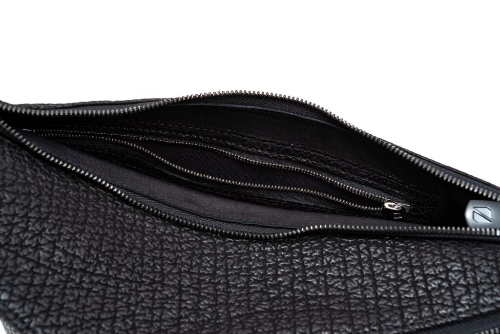 細かいシボが特徴のサメ革は、ワニやヘビなど他のエキゾチックレザーよりも落ち着いた印象で、どんなファッションにもしっくり馴染んでくれます。しかも、コチラのバッグは画像をご覧いただければおわかりいただけるように、ふつうの長方形ではございません。横方向にも奥行き方向にもサイズに差をつけた3Dシルエットで、少々厚みや幅のあるものも収めやすくなっております。さらにダブルジップは一般的なセンター合わせではなく、左右の両端に配置。左手でも右手でも一発で全開閉できる仕様で、実に気配りの効いたボディバッグなのです。