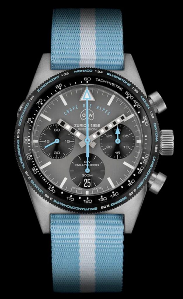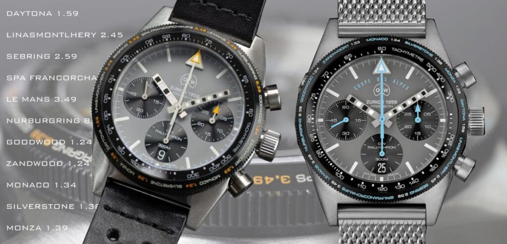 オレッヒ&ワイス(O&W)のRallychron(ラリークロン)/Rallychron CA(ラリークロン CA)は、1960年代のカーレース黄金期をリスペクトして発売されました。もっとも特徴的なのはモチーフにチェッカーフラッグを引用したインパクトあるバーダイアル。加えて数々のドラマを創り出した11ヶ所のサーキットでの「理論上の最速ラップタイム」を刻みつけた回転ベゼル。遊び心溢れたデザインですが、そのベゼルの内周にはタキメーターが配置され、O&Wの機能を重視した姿勢に抜かりはありません。