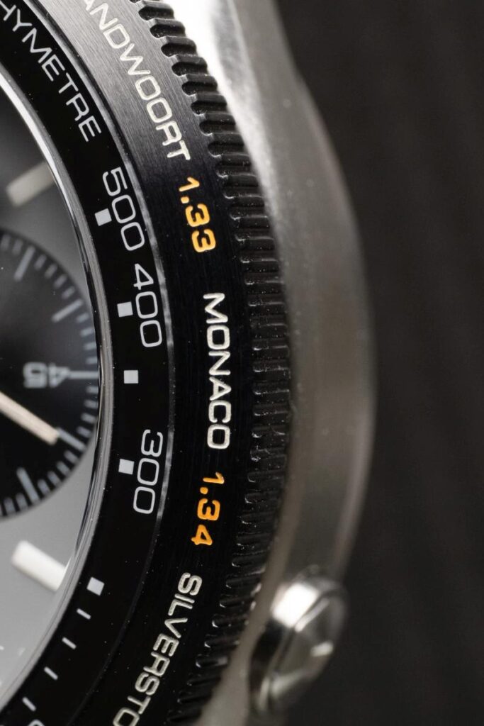 ベゼル外周に刻まれた11のサーキットの「理論上の最速ラップタイム」