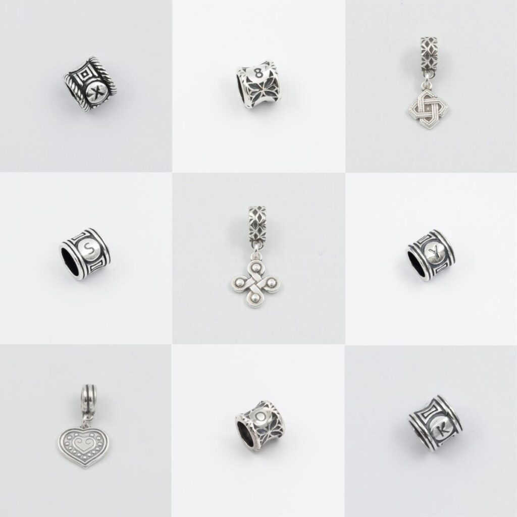 前の持ち主に大切にされていたそれぞれのチャームは、ヘルシンキの工房で一つひとつ丁寧に修復され、再び美しい輝きを取り戻しています。チャームのサイズは約1cm~で、古代のシンボル、アルファベットや数字など、さまざまな種類をご用意しております。