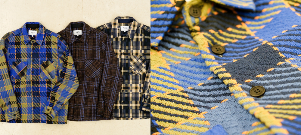 今POP UPに、先行販売のオーバーシャツを6型リリースします。毎シーズン20~30種類の新作が登場する中、今回のイベントの為にエクスクルーシブでデリバリーされた特別な6型です。6型のうちの3型はコットンを中心としたファブリックによるホワイティングオーバーシャツ。落ち着いたトーンのカラーリングは、シーズンレスにスタイリングできるユーティリティなアイテム。さらに普段お目にかかれない刺し子のようなテキスタイルを用いたモダンテイストな一枚も。