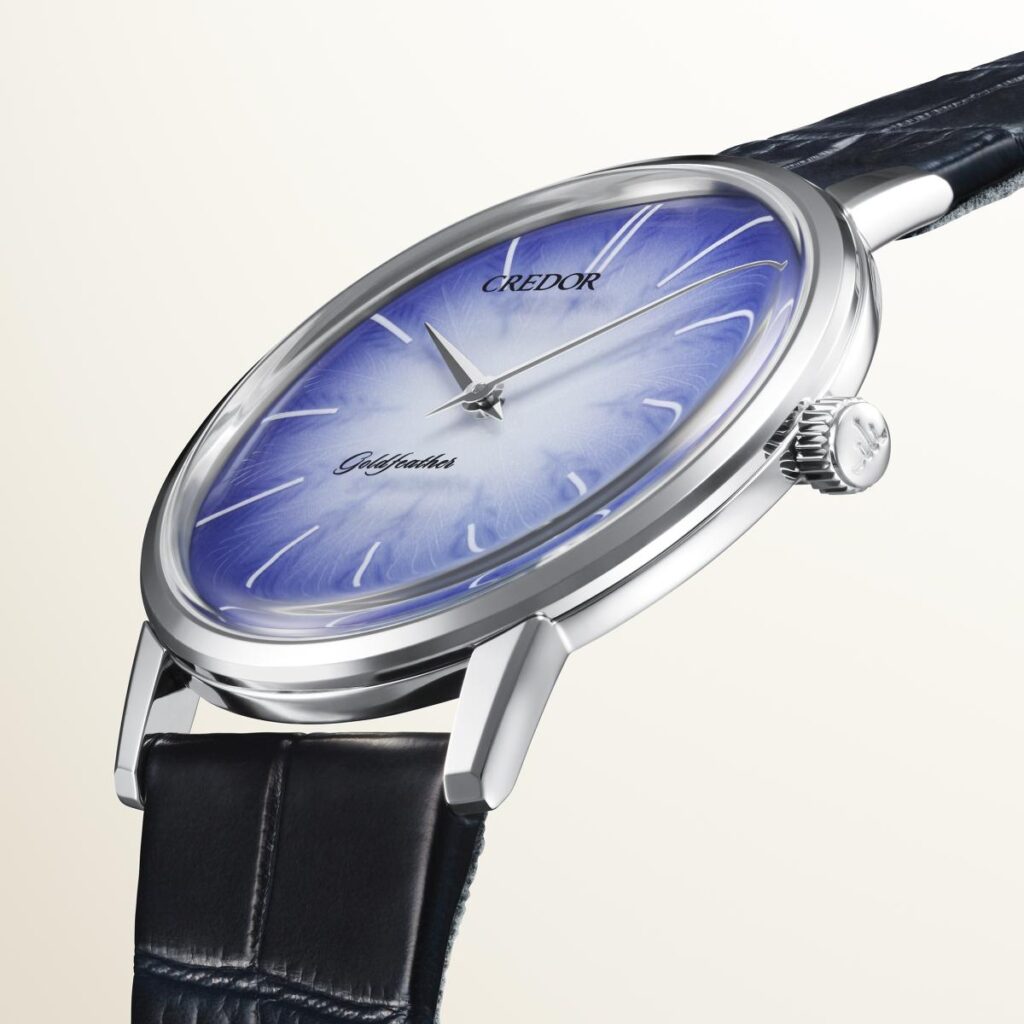 セイコーの薄型メカニカルウオッチの系譜を受け継ぎ、<クレドール>の名のもとに蘇った「ゴールドフェザー」は、現代にふさわしい高級薄型メカニカルウオッチです。羽根のように「薄く」、「軽やかで」、「空気をはらみ」、「艶やかで」、「優美」であることをデザインコンセプトとし、現代のドレスウオッチとしてふさわしいスペックとデザインにアップデートしたコレクションです。