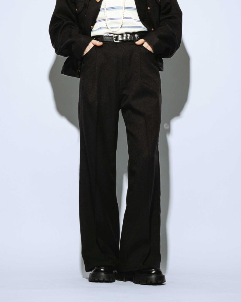 ジャケットは、定番のMJ124をベースに身幅にゆとりをもたせて、女性でも着やすい丈感に調整し、シンチバックなどのディテールを追加したスペシャルなアイテムに仕上げています。ボトムスは、ランチャーらしさを残しながら、腰回りがスッキリ見えるようにタックを入れてややワイドなシルエットに仕上げています。