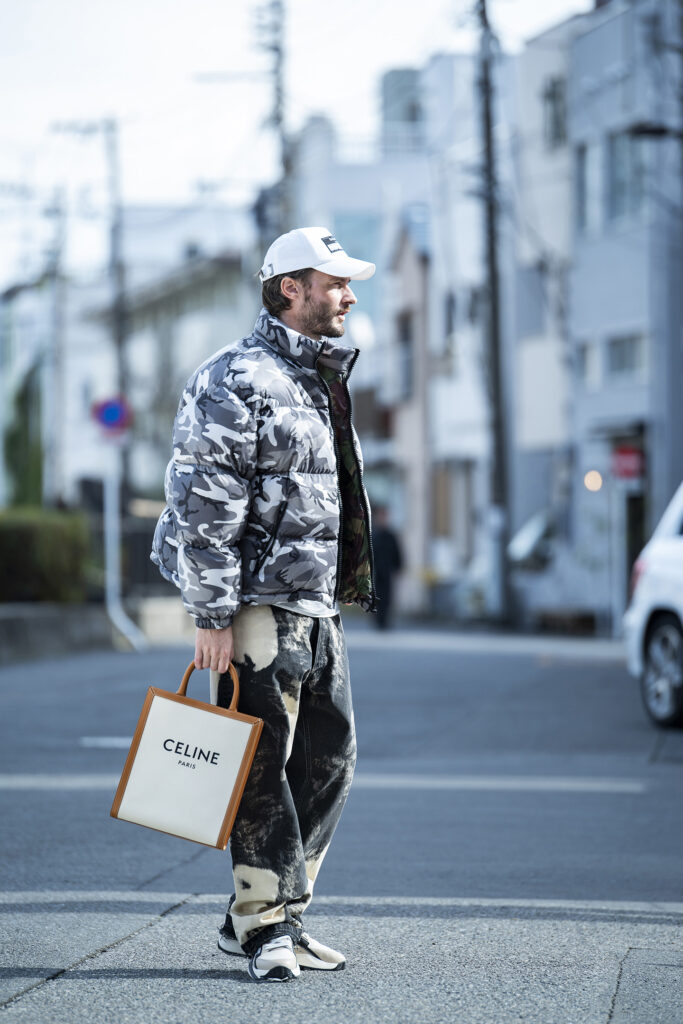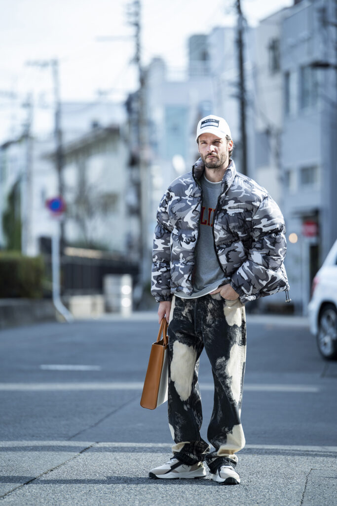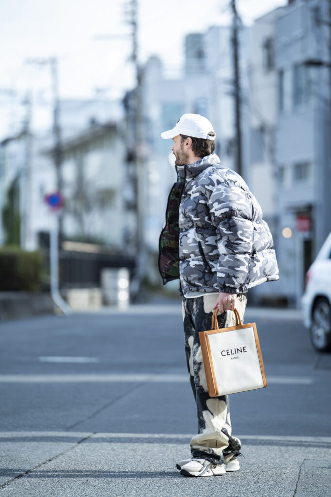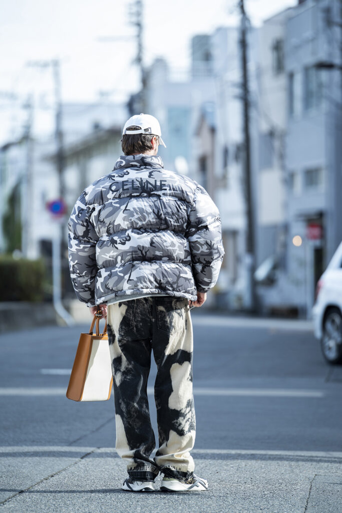 派手になりがちなカモフラ柄ダウンを軸に、ストリート感の強いブリーチデニムパンツを投入し、“大人のやんちゃ”なムードを演出。セリーヌのレイヤードTシャツで程よい軽さと抜け感を出し、タフな印象になりすぎないよう計算。バルマンのキャップでストリート感を強調しつつ、フェンディのシャープなスニーカーと上質なトートバッグで足元と手元に品格を忘れずに。リラックスした休日にこそ真価を発揮する、攻めのラグジュアリー×カジュアルです。