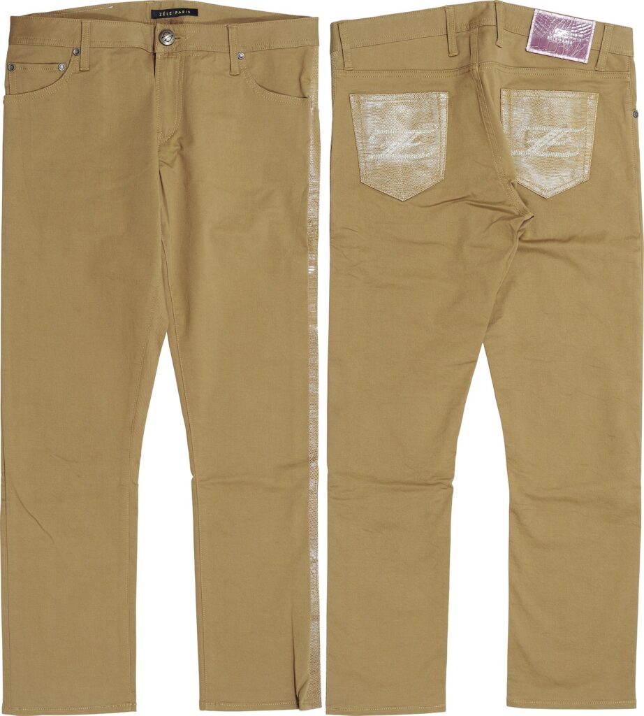 左サイドとバックポケットにリザードレザーをあしらったデニム。温かみのあるベージュが、冬のカジュアルに上質感を与える。着用サイズ:34。37万8000円