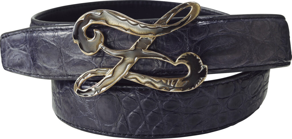 圧倒的な存在感を放つクロコダイルレザーのベルト。バックルは独特なグラデーションで、重厚さと品格を放つ。35mm幅。41万7000円