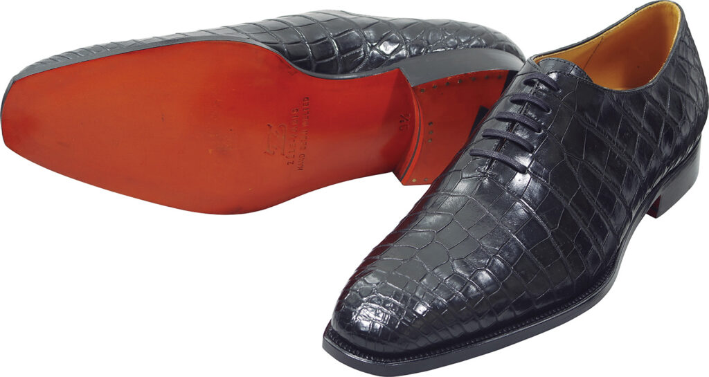 クロコダイルレザーを一枚革で仕立てた極上のシューズ。シンプルでありながら、大人の着こなしに貫録のある足元をもたらしてくれる。128万円