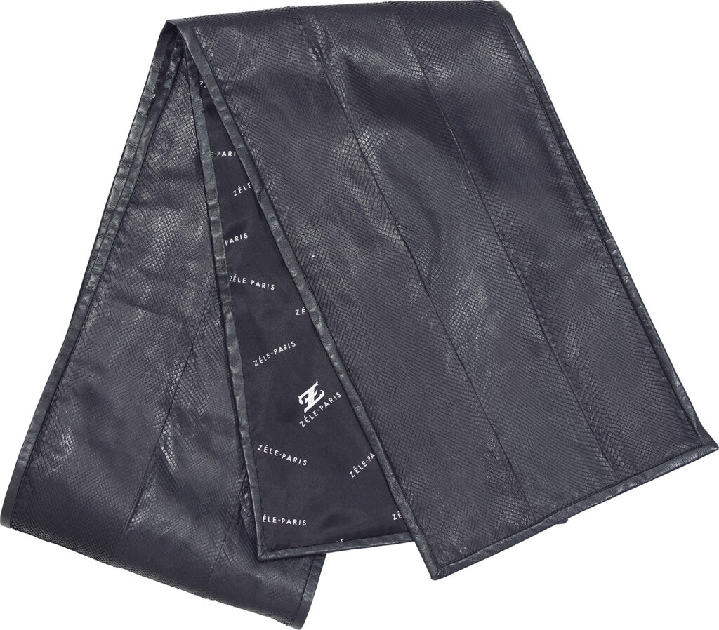 繊細な鱗模様が魅力のパイソンレザー(フロントカット)のマフラー。裏地にシルクを配し、肌当たりまでラグジュアリー。25cm×185cm。45万8000円