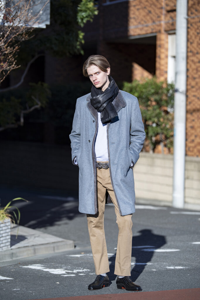黒のフロントカット パイソンレザーのマフラーは、クールさが段違い。それをワンループで“くるり”と収めたスタイルがコチラ。マフラーの繊細な鱗模様が美しい光沢感を生み、さりげない色気を添えてくれます。カシミヤ×ミンクのコートが纏う、柔らかな華やかさ。そして品のある色使いのコーディネートを端正にまとめ上げるその姿は、完成度の高いエレガンスの象徴です。マフラーと同様にレザー小物は黒で統一し、上品さの中にも無骨な存在感を残しました。