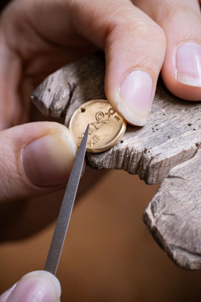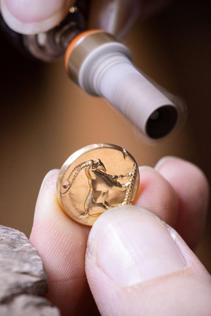 成形後、メダルに繊細な風合いをもたらすべく、細心の注意を払ってゴールドに再加工が施されます。これにより、レリーフのモチーフが表面に浮かび上がり、さらに丹念な研磨によって高められた貴金属の輝きが、モチーフを一層鮮やかに際立たせます。