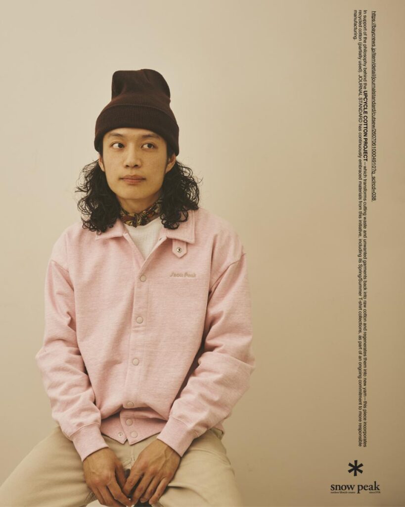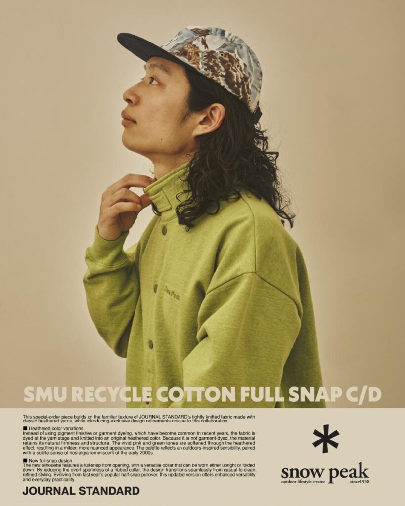 JS限定で展開される本作は、裁断くずや不要衣類を再生する「UPCYCLE COTTON PROJECT」の思想を反映するなど、SNOW PEAKの代表的な素材使いや機能性をJSのフィルターで再構築したシリーズ。