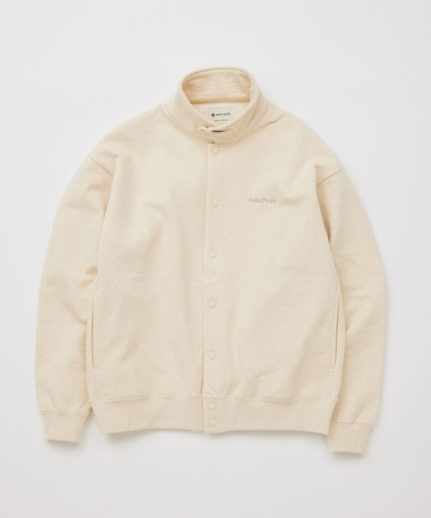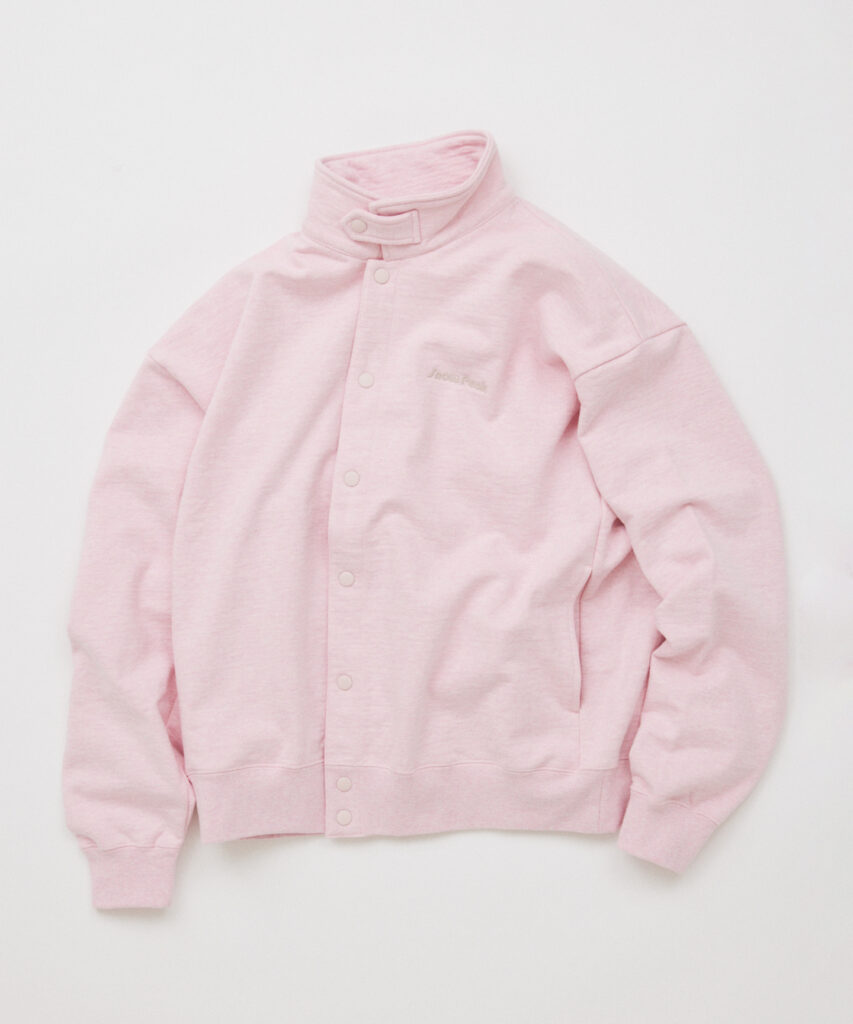 スウェットは定番の度詰め杢素材をベースに、糸染めによるカラー杢で別注。鮮やかなピンクとグリーンをカラー杢でマイルドに表現し、アウトドアブランドらしい色味と2000年代を想起させる空気感を備える。フルスナップ仕様と立て寝かせ両用の襟が、リブ襟など特有のスポーティさを抑え、幅広いスタイリングに対応できるようアップデート。
