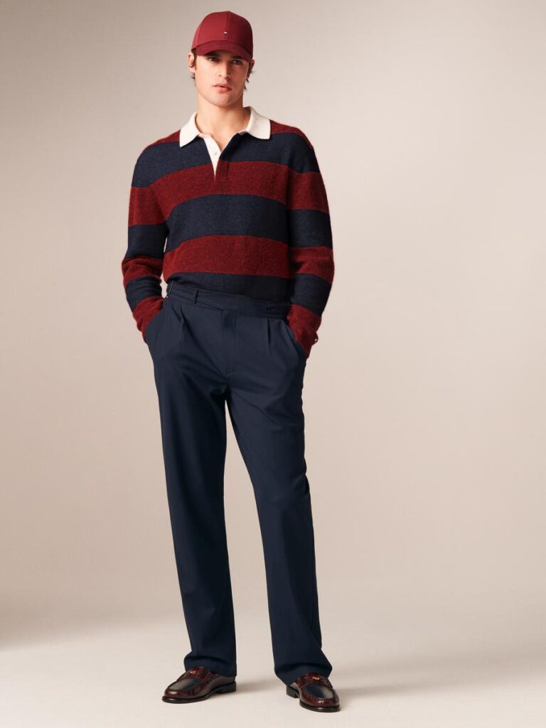 アメリカンスタイルが持つエフォートレスな佇まいに着想を得たレイヤードスタイルも、本コレクションを象徴する要素のひとつです。ヴァーシティジャケット、ラグビーシャツ、オーバーコートといったトミー ヒルフィガーのクラシックアイテムは、起毛ウールやカシミヤ混など、冬らしい豊かな質感の素材で再解釈。タイムレスなグレンチェックや、表情豊かなドネガルツイードなどのヘリテージパターンで仕上げられています。さらに、深みのあるレッド、クリーンなホワイト、高級感のあるブルーを裏地のストライプや切り替え部分に配し、コレクション全体にトミー ヒルフィガーならではのツイストを添えています。
