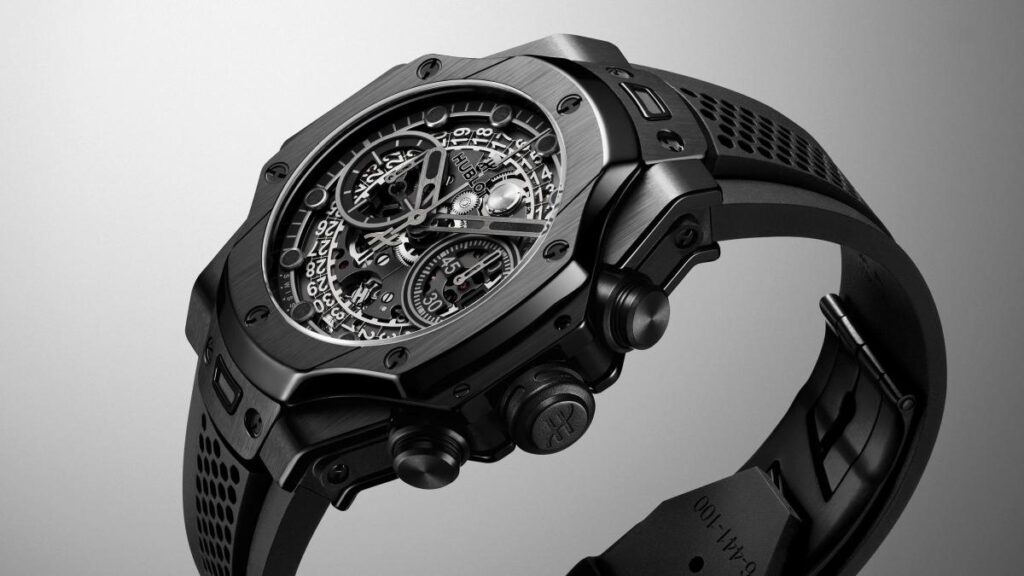 この時計は、サテン&ポリッシュ仕上げを施したブラックセラミック製の42mmケースを採用し、「ビッグ・バン」シリーズの特徴である大胆なジオメトリーとモジュラー構造を反映しています。オールブラックのセラミック仕上げを選択したことで、SR_Aは洗練されたミニマルな美学へと回帰しています。