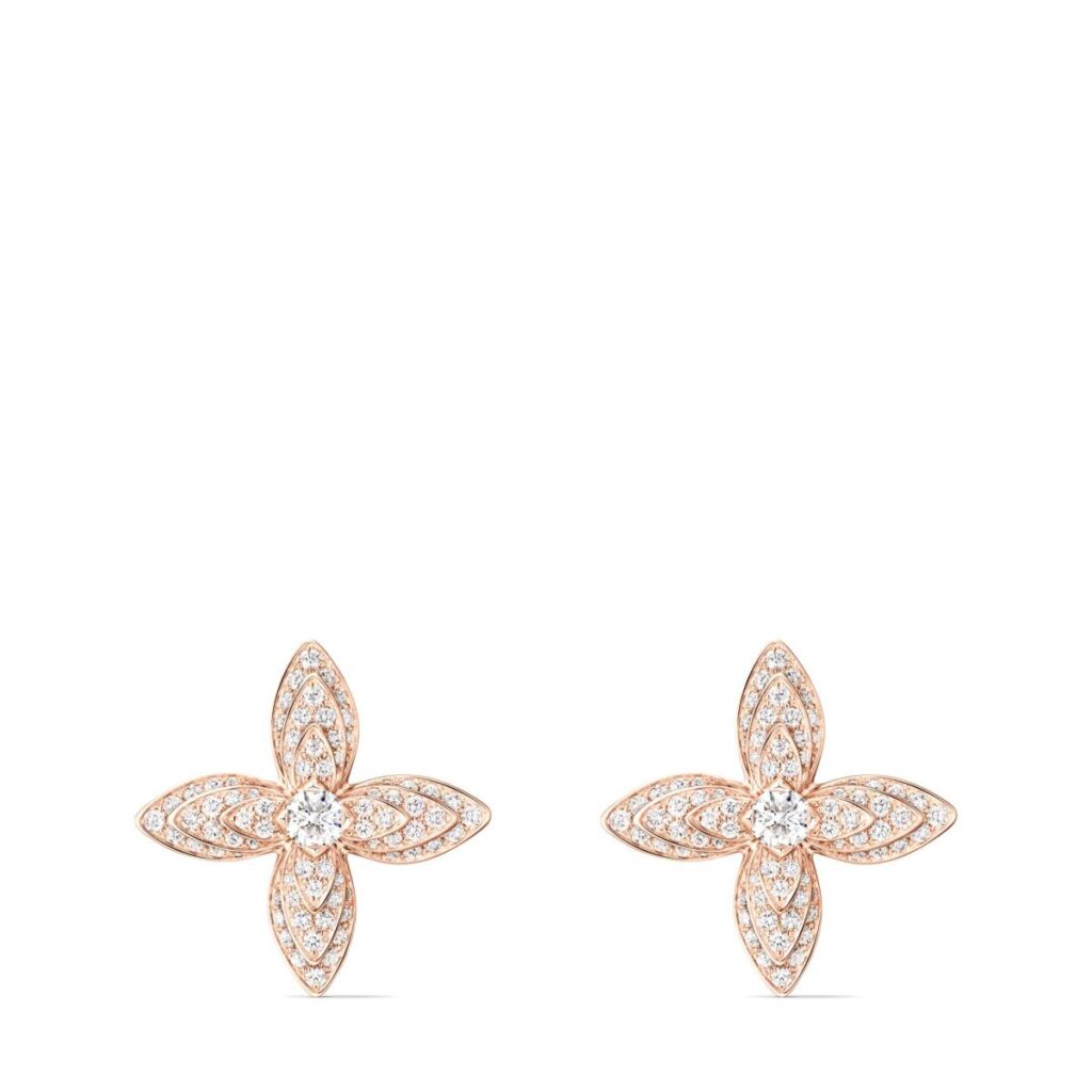 当初、ホワイトゴールドとダイヤモンドの組み合わせで登場した、スレンダーなモノグラム・フラワーが、今回は目を奪われるほど魅惑的に輝く、ローズゴールドの新しいバリエーションとなって姿を現します。強く光輝くペンダント、顔周りを瞬く間に輝かせる優美で洗練されたピアス、目を見張るほどに壮麗な唯一無二のリングの中心で、モノグラム・フラワーが咲き誇っています。