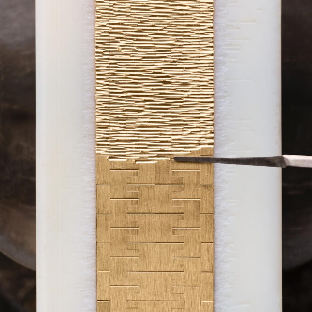 デコ パレス(パレス装飾)は 1961年に初めて開発され 、ピアジェが1969年に発表した「21st Century」の突出した特徴となりました。ギョーシェ彫りからインスピレーションを得た、質感のある表面は、滑らかに磨かれたゴールドという長年の伝統に挑戦し、貴金属を構造的な支持材から、表現力豊か、芸術的そしてスリリングな焦点へと変貌させました。手で自由に描く、流れるようなデコ パレス(パレス装飾)は、卓越した金細工の技術によってのみ実現できます。ビュランの鋭利な先端を使用して、手作業で一本一本の線や溝をゴールドに刻みます。リズミカルかつ思慮深さの求められる工程では、各動作の後、ゴールドの削りくずにそっと息を吹きかけて表面から取り除きます。デコ パレス(パレス装飾)の解釈は、それぞれが唯一無二であり、金細工職人一人ひとりが独自の技法を持ち、異なる圧力、異なる角度、異なる速度、異なる動作で、個性的な芸術作品を作り上げているからです。これは、ピアジェが職人への献身と、人の手作業の重要性を浮き彫りにしています。