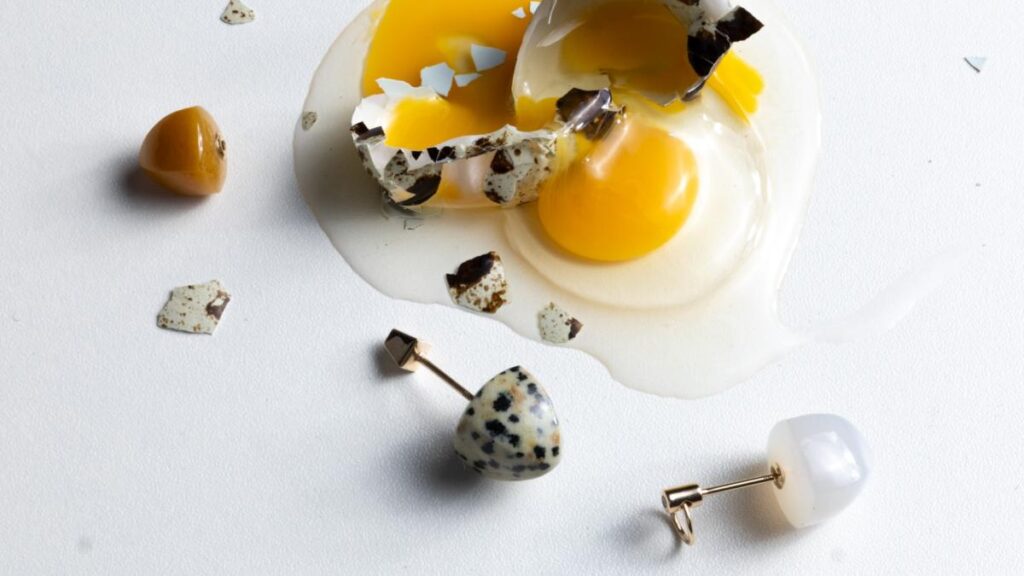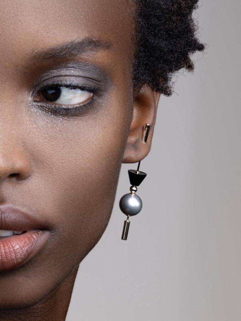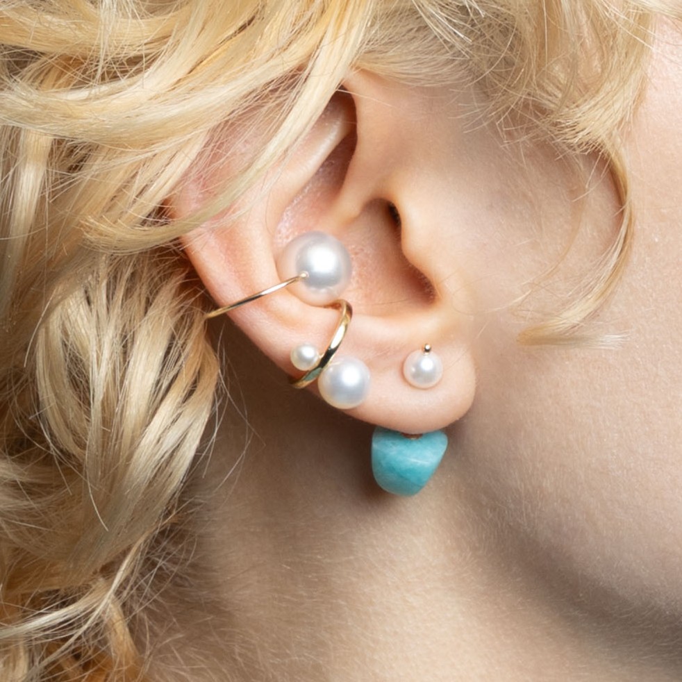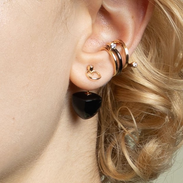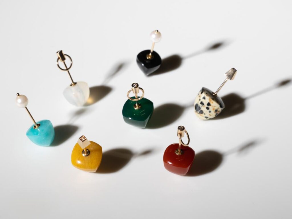 ベースになるピアスのデザインは、ピラミッド、ドアノッカー、アコヤパールの3種類。シュガーローフカットのカラーストーンがスタイリングのアクセントに。シュガーローフカットは、かつてヨーロッパで使われていた円錐形のお砂糖の塊「シュガーローフ」に由来します。まだお砂糖が貴重だった時代、その美しいフォルムは豊かさと特別な甘さの象徴でした。なだらかに盛り上がるこのカットは、古くから色石の濃密な美しさを引き出すために用いられてきた特別なカット。 鮮やかな鉱物の色彩と幾何学的なデザインで楽園の鳥を表現し、ダルメシアンジャスパー、イエローアベンチュリン、ホワイトカルセドニー、カーネリアン、ブラックオニキス、グリーンアゲート、アマゾナイトといった天然石が生み出すエネルギーに満ちています。