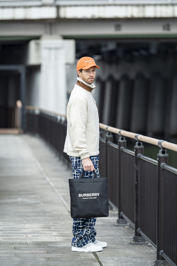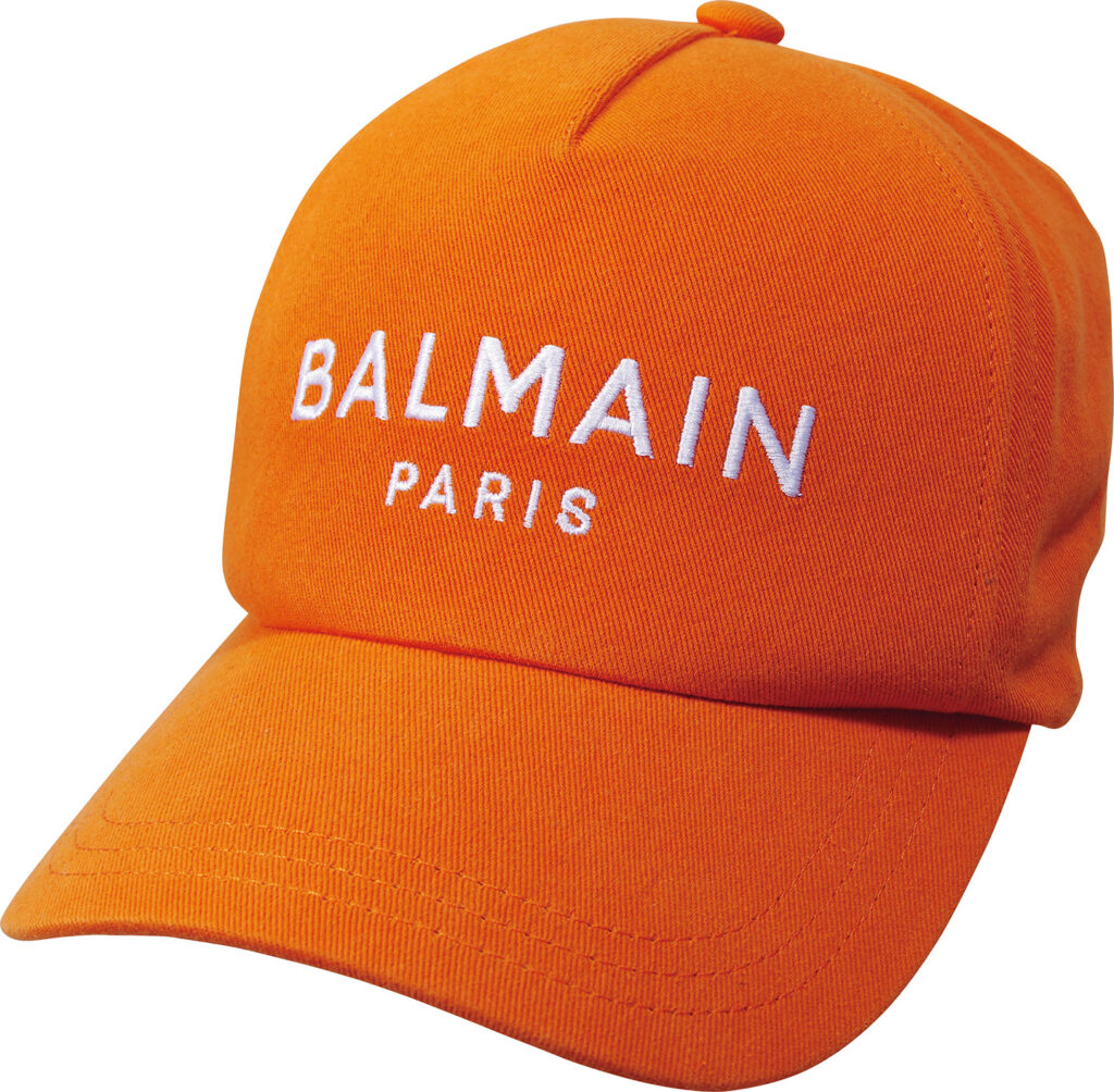鮮やかなオレンジのロゴ刺繍キャップが春のコーデを彩る。4万7300円