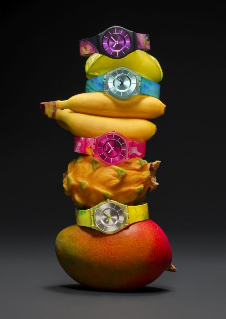印象的なカラーコンビネーションの魅力は、デザインによってさらに引き立てられています。コレクションのすべてのモデルは、1997年に誕生したSwatchの象徴的なSKINラインの純粋なミニマリズムを体現しています。「Less is More」という思想のもとにデザインされた、超薄型のシルエットで超軽量のフォルム、そして洗練されたデザインは、忙しい日常の中で自由と軽やかさを感じさせる、まるでトロピカルなオアシスのような存在です。