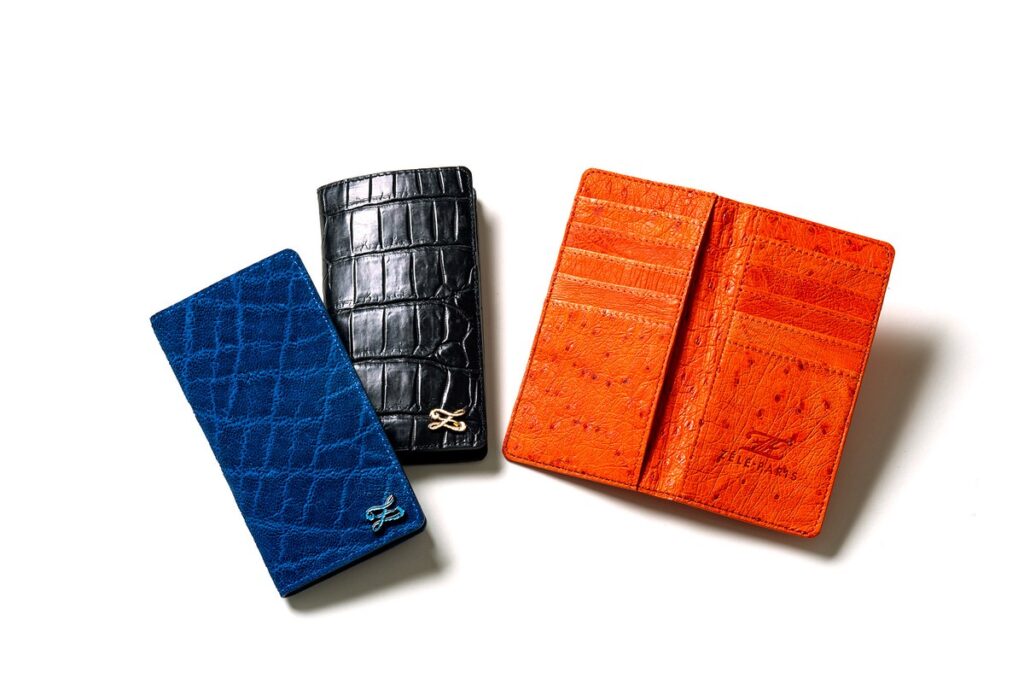 黒のモノはエキゾチックレザーの代表格であるクロコダイル。艶と腑の並びの美しさは、クロコダイルレザーの品質に絶対の自信を持つ「ZELE-PARIS」ならではの逸品です。