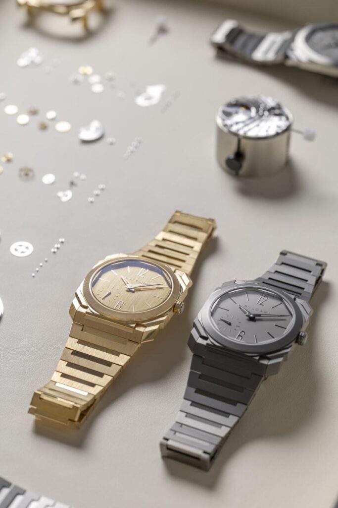ひとつめはチタン製です。モダンでテクニカルな超軽量素材であるチタンは、「オクト フィニッシモ」のコレクションの代名詞とも言える素材であり、「オクト フィニッシモ」の10のモデルで使用されています。うち7モデルは2026年春時点で、それぞれのカテゴリーで最薄世界記録を保持しています。これには2016年発表の世界最薄ミニッツリピーターと、GPHG(ジュネーブ ウォッチ グランプリ)で「AIGUILLE D’OR (金の針賞)」を受賞した2021年発表の世界最薄パーペチュアルカレンダーが含まれます。