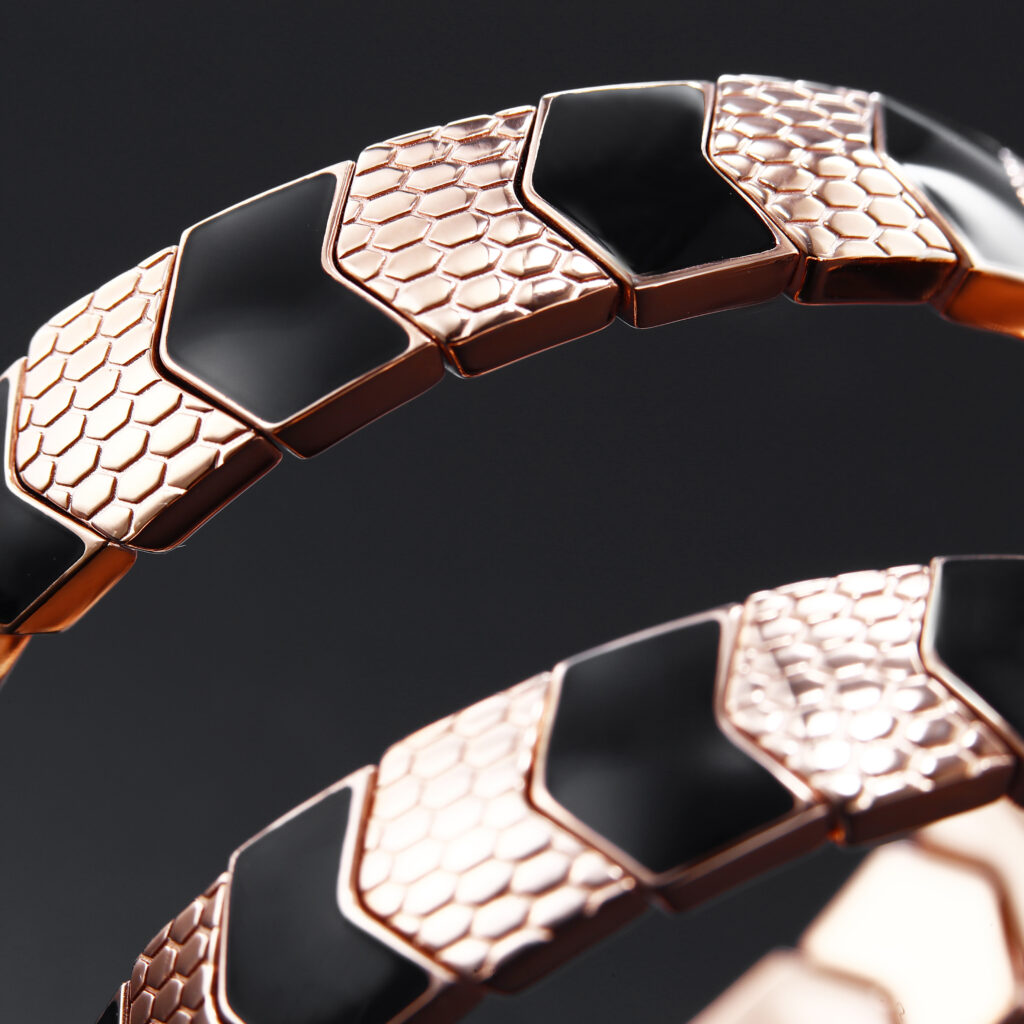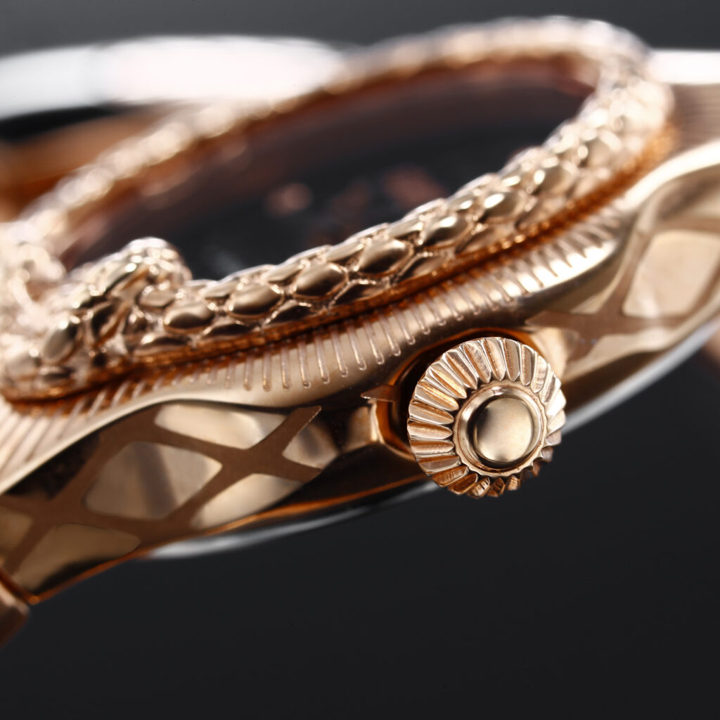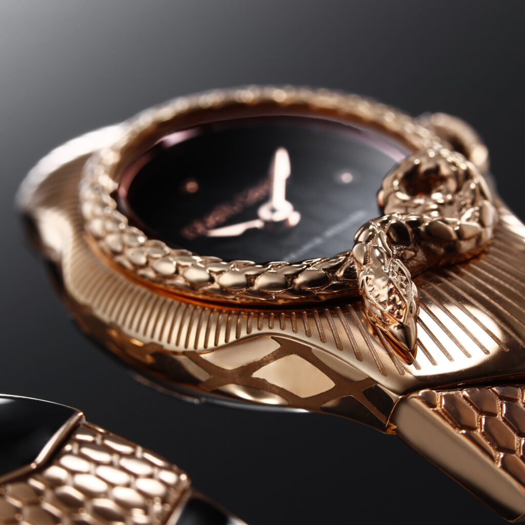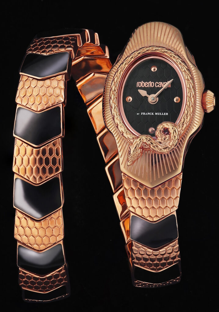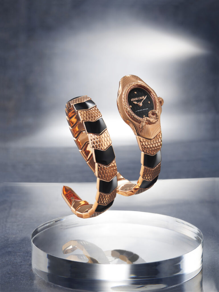 ダイヤルにスネークが絡みつくようにデザインされたケース。鱗をイメージしたローズゴールドのコマとブラックのコマを互い違いに配列させてインパクトを強めた胴体。ロベルト カヴァリの優れた審美眼が垣間見れる1本ではないでしょうか。