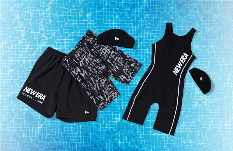また、キャップブランドとしての背景を活かし、ニューエラロゴを配したスイムキャップもラインアップ。スイムウェアとあわせて、水辺でのスタイリングを提案します。