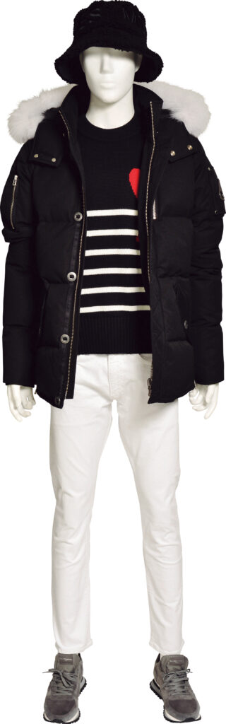 ひと口に「白」と言っても様々で、ここではダウンもパンツもベージュがかったオフホワイトカラーを選択。インナー・キャップ・シューズはブラウン系で揃え、色の数を極力減らすことで上品な印象を醸し出しています。