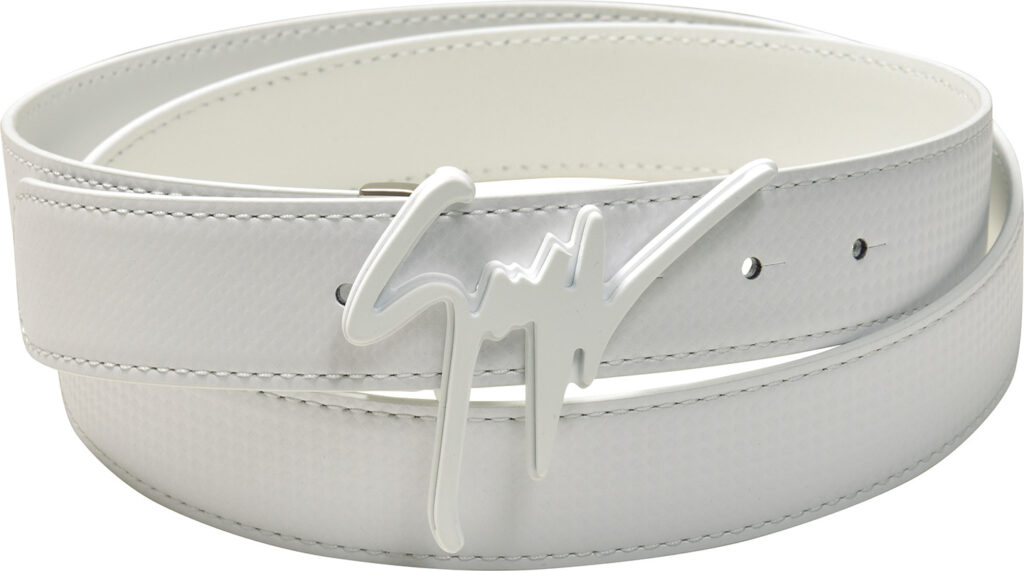 白で統一したモダンなバックルベルト。少し細めの35mm幅。6万8000円